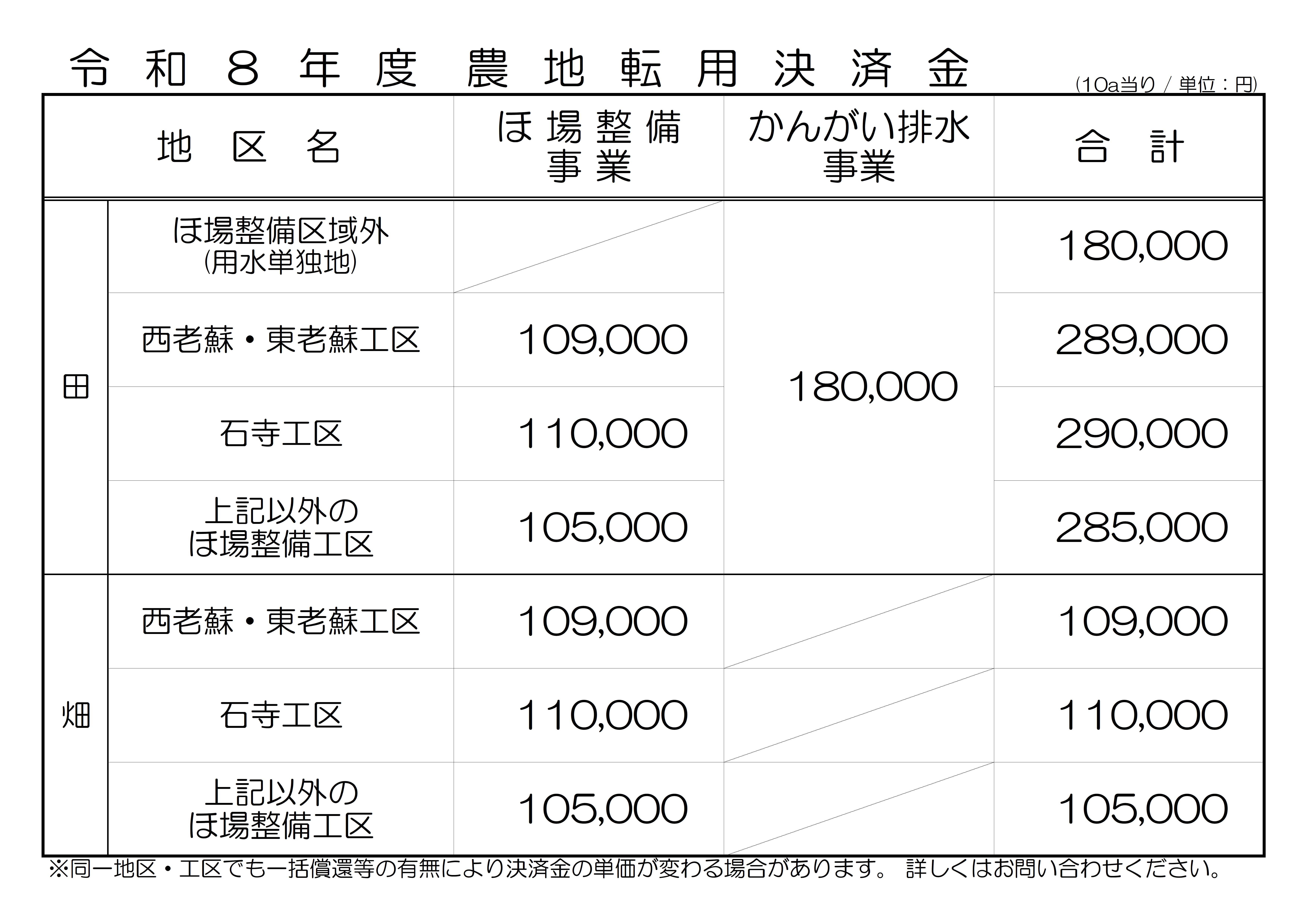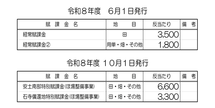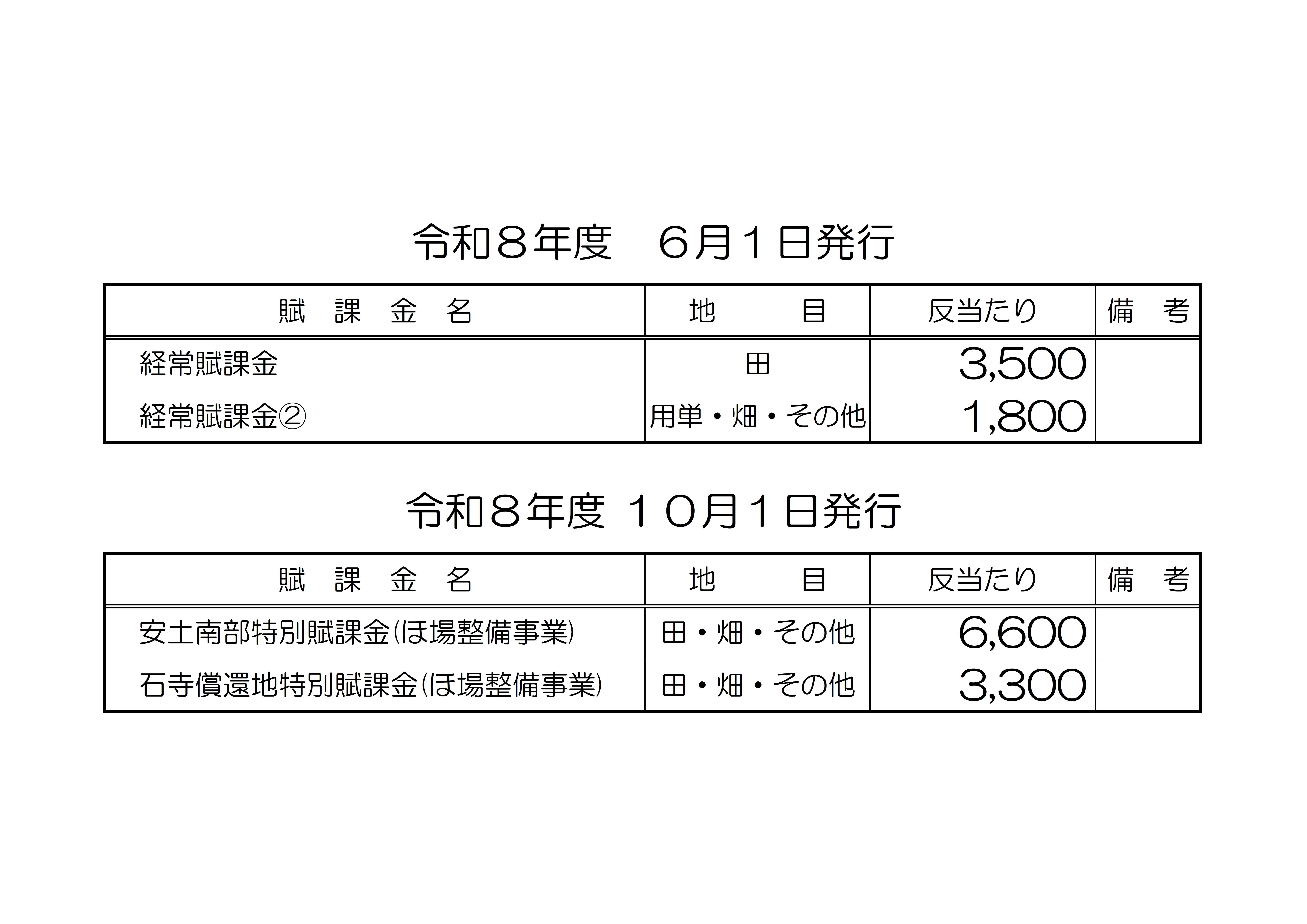 土地改良区の令和8年度の賦課金はつぎの通りです。